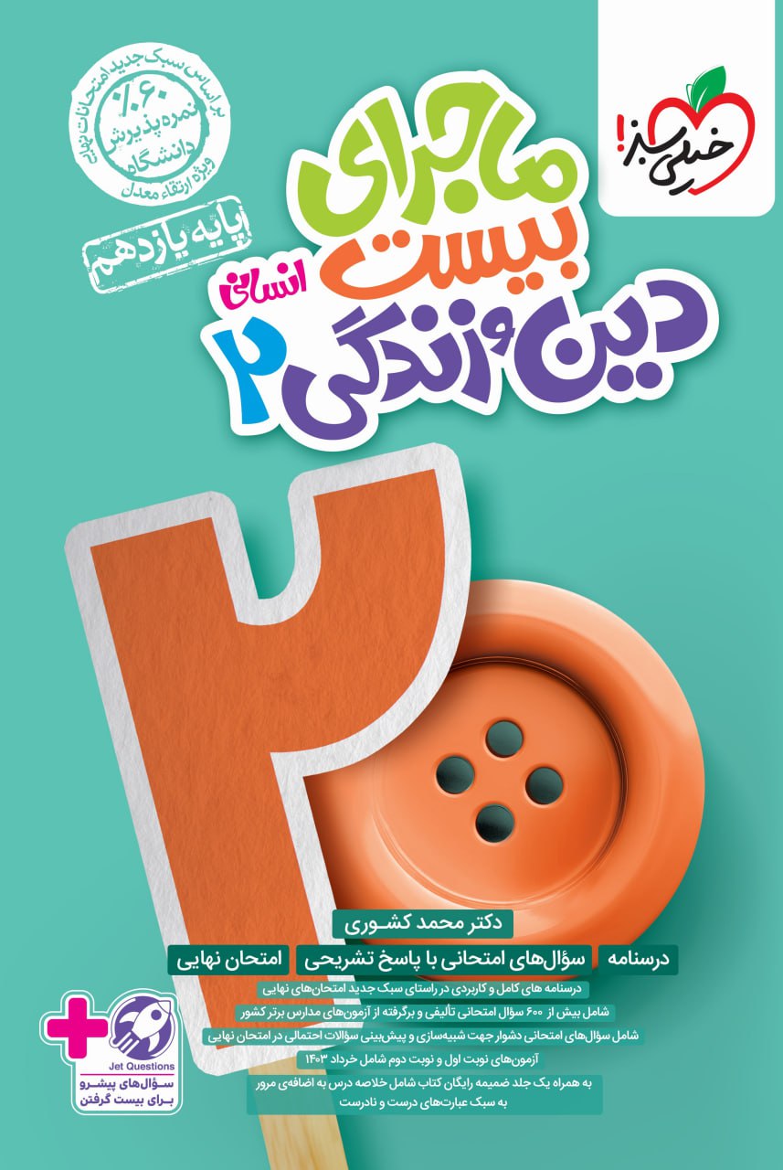 کتاب ماجرای دین و زندگی انسانی یازدهم انتشارات خیلی سبز، برای دانشآموزانی که قصد دارند امتحانهای تشریحی ترم اول و دوم این درس را با موفقیت طی کنند انتخاب بسیار مناسبی است. این کتاب آموزشی همراه با درسنامهای تألیفی و کامل خود میتواند منبعی اصلی برای دانشآموزانی که فقدان کلاس آموزشی را دارند مفید باشد. این کتاب با فصول هماهنگ با کتاب درسی و لحن ساده و روان خود از چند بخش تشکیل شده است. بخش اول درسنامهی کتاب است که نکات مهم هر درس را بهطور کامل توضیح داده است. بخش دوم پیام آیات و احادیث است که احادیث کتاب درسی را ترجمه کرده و نکات و مفاهیم آن را برای شما بازگو کرده است. بخش سوم کتاب سؤالهای امتحانی است که همانطور که از اسم عنوانش مشخص است سؤالات امتحانی را شامل میشود تا دانشآموز با انجام آن برای آزمونهای مشابه آماده باشد. بخش بعدی سؤالات چهارگزینه ای است که تعدادی سؤال تستی برای شما طرح شده تا با این مدل از سؤالات هم آشنایی داشته باشید. بخش پنجم پاسخنامهی تشریحی است که به سؤالات بهصورت تفصیلی پاسخ داده و علت درستی گزینههای صحیح توضیح داده شده است. بخش ششم و پایانی کتاب امتحانات نیمسال اول و دوم است که چند نمونه امتحان نیمسال اول و دوم با پاسخ تشریحی آنها ارائه شده است.